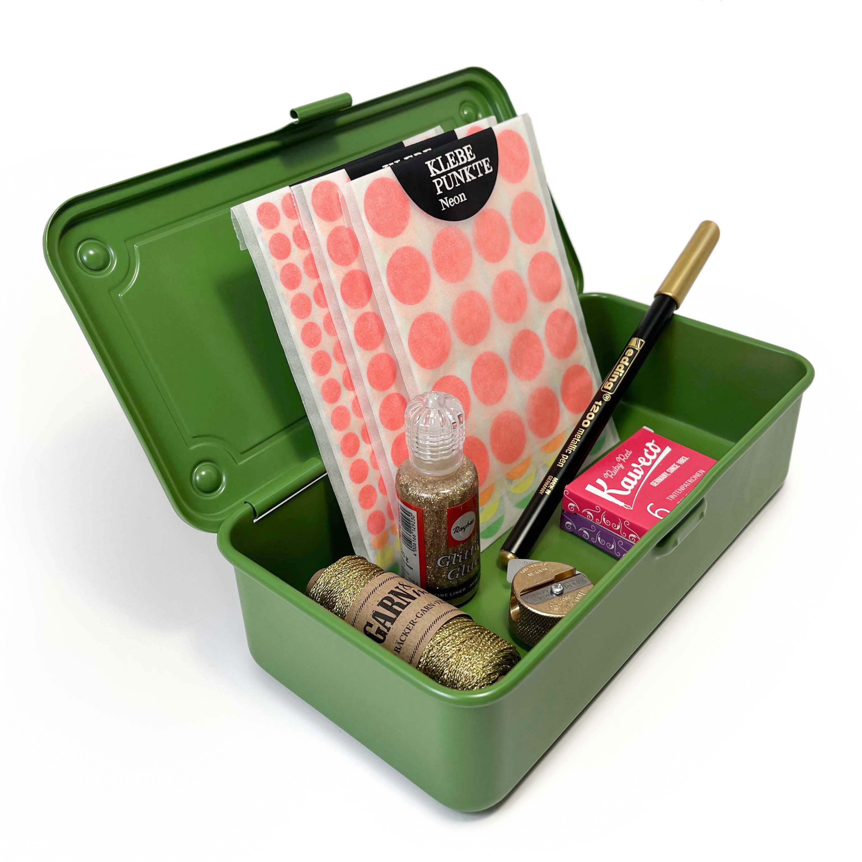 Diese wunderschön gefertigte Werkzeugkiste von Toyo Steel ist ein japanischer Klassiker. Ober- und Unterteil bestehen vollständig aus einem einzigen Stück massivem japanischem Blech. Dadurch ist die Konstruktion unglaublich robust und dennoch leicht.